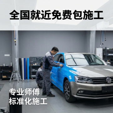 [画面元素] 中心展示汽车美容店师傅专业施工场景,师傅佩戴干净手套正在为特斯拉车门贴改色膜,店内工具摆放整齐整洁,背景为标准化施工工位,暖光氛围,画面自然生动