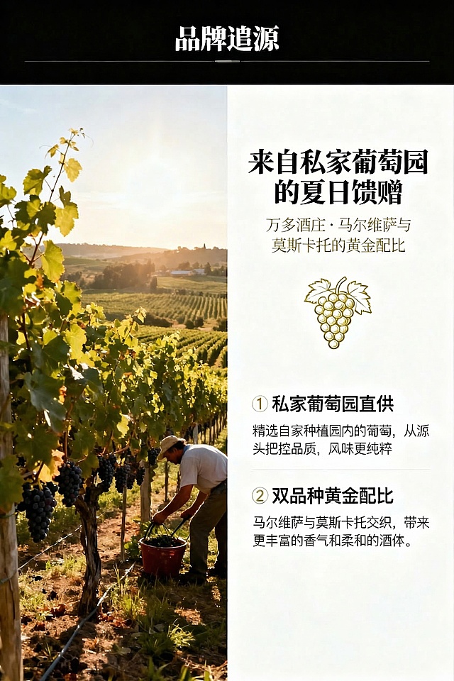 以图中起泡白葡萄酒为主体,设计首屏KV页:产品瓶身居中,背景为浅米白渐变的夏日海边场景,瓶身与酒杯光影柔和,突出粉橙撞色酒标活力感;主标题“夏沫起泡白葡萄酒 | 把夏天的甜,装进瓶里”用超大号粉橙渐变无衬线粗艺术字体,位于画面上半部分;副标题“6% vol 低醇微醺・三重果香・绵密气泡”用中号浅金色常规字体,在主标题下方;底部小字“万多出品・意大利风味”;中心对称式排版,背景留白充足;色彩占比主色60%、辅助色30%、点缀色10%,留白率不低于30%,整体清新高级详情