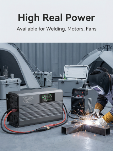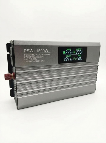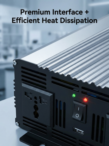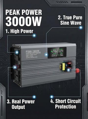 Pure sine wave inverter full parameter specification display, product on the left, technical parameters list on the right: Parameters include Power, Input Voltage, Output Voltage, Frequency, Protection Features, all text in English, thin line box table layout, professional and clean, dark gray technology style, 3:4 proportion, high definition, text clearly visible, no text blocking product main body
