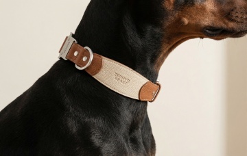 严格还原上传的薄荷绿AirTag狗项圈 holder产品,保留所有包装设计、颜色、LOGO位置、文字内容、图案元素细节。展示狗狗脖子佩戴酒红色该AirTag保护套,保护套上雕刻文字"ROCKY, CALL MY MOM",狗狗爪子搭在美式模特主人的手上,柔和暖光,模糊公园背景,顶部用粗无衬线字体放置主标题"Your Pet’s Identity, Customized Just For Them",主标题下方用较小字体放置副标题"Peace of Mind When They Wander",杂志风格排版,亲密温暖美式家庭宠物审美,高分辨率,产品柔焦。