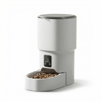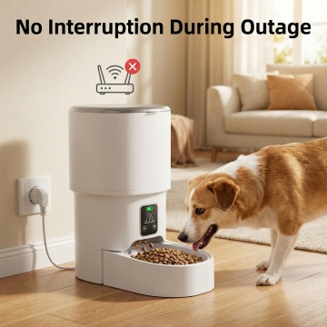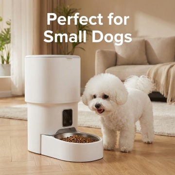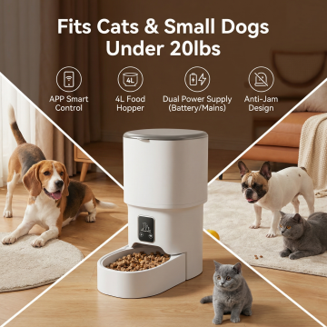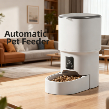欧美跨境电商主图,产品严格按照原图,保留原产品智能喂食器的外观、造型和结构,不改变产品本身,生成产品主图,背景为简约现代家居场景,不是纯白色背景,突出英文品牌和产品名称,图片尺寸800X800,风格简洁大气符合欧美跨境电商审美,产品展示清晰,英文文字突出
