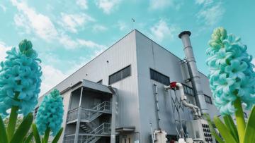 现代主义风格工厂建筑,简洁的白色几何体块外观,大面积玻璃幕墙入口,整齐排列的条形窗户,开阔的混凝土广场,道路旁点缀着几棵高大的绿树,晴朗的蓝色天空中飘着少量白云,光线明亮柔和,阴影清晰,整体呈现出干净、专业、高效的工业氛围。