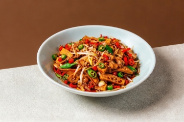 保留原图中的卷粉美食,去除所有文字和原有背景,更换为更好看的浅青陶瓷圆盘,重新设计好看的摆盘方式,保持卷粉红油蘸料、香菜葱花配料不变,干净纯色背景,商业高端美食摄影,柔和漫射光影,没有任何文字,极具食欲