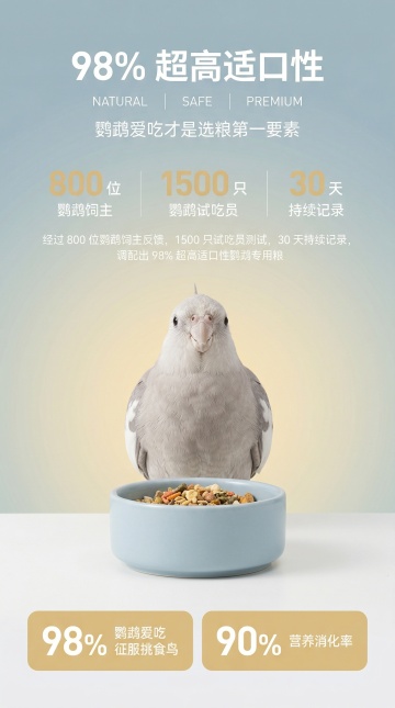 高端温馨宠物商业摄影风格,柔和自然的影棚光影,画面干净通透,细节拉满。画面顶部居中排版:超大号加粗深暖棕主标题 “鹦鹉常见问题”,其中 “常见问题” 为焦糖黄字体;标题下方居中放置浅暖灰细体副标题 “历时半年之久,调研 1000 位鹦鹉饲主,发现中小型鹦鹉喂养问题主要三个方面”。标题下方为三个等宽并列的圆形进度条数据模块,从左到右依次为:焦糖黄圆形进度条搭配深暖棕大号数字 “65%”,下方深暖棕文字 “羽质问题”,再下方浅暖灰小号文字 “羽色暗淡 | 掉毛 | 羽粉少 | 断羽”;焦糖黄圆形进度条搭配深暖棕大号数字 “25%”,下方深暖棕文字 “肠道问题”,再下方浅暖灰小号文字 “软便 | 拉稀 | 消化不良 | 挑食”;焦糖黄圆形进度条搭配深暖棕大号数字 “10%”,下方深暖棕文字 “其他问题”,再下方浅暖灰小号文字 “钙磷失衡 | 换羽缓慢 | 繁殖期营养不足”。画面中间主体为一只虎皮鹦鹉 + 一只牡丹鹦鹉,站姿灵动,神态活泼可爱,羽毛蓬松有光泽;鹦鹉周围均匀环绕 6 个带高光的透明玻璃质感气泡标签,分别标注深暖棕文字 “天然羽粉营养素”“黄金钙磷组合”“昆虫小分子蛋白”“复合维生素群”“天然抗氧化组合”“益生菌护肠配方”。画面最底部为左对齐的浅暖灰小号备注文字 “* 数据来源:宠帮仕宠物营养实验室”。整体画面温馨专业,痛点清晰,符合高端电商详情页设计标准,色调风格跟上一屏保持一致。