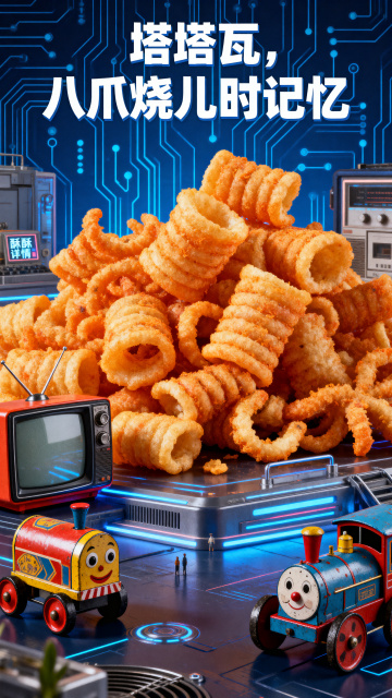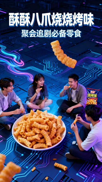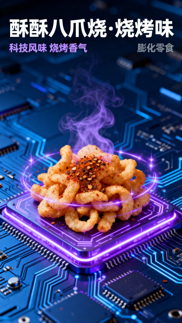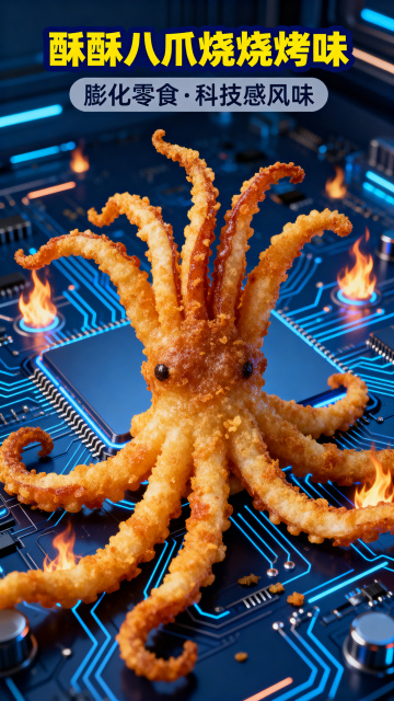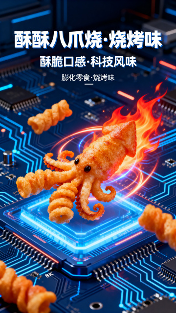 酥酥八爪烧烧烤味膨化零食电商详情页,深蓝色电路板科技科幻风格,打开包装袋倾倒出八爪烧的动态效果展示,科技光影特效,高饱和度视觉冲击力强,8K高清