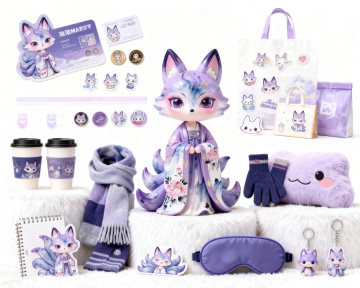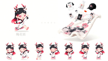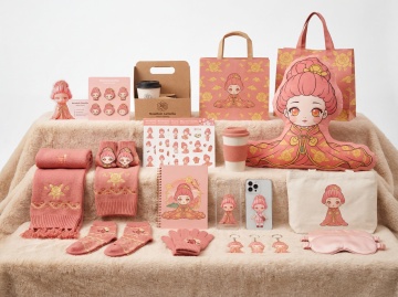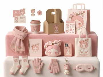 基于参考图中的芍药花妖IP形象设计可爱童趣风格周边产品,包含异形名片、多个徽章、提手架、包装袋、多个贴纸、咖啡杯及杯套、围巾、袜子、手套配饰、线圈笔记本、毛绒抱枕、手机壳、手提袋、钥匙链、眼罩,所有产品有序陈列在带有毛绒展台的白色背景画面中,所有产品延展使用该IP元素,风格统一,专业布光专业产品摄影,呈现干净专业的品牌视觉氛围,突出产品多样性与品牌一致性