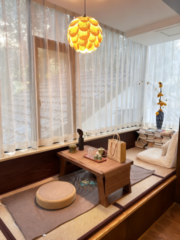 温馨明亮的日式禅意风格餐厅内部场景,原木色餐桌搭配米色布艺餐椅整齐排列,低矮的和纸灯笼与木质格栅吊灯柔和照明,浅灰色水泥地面干净整洁,大面积落地窗引入自然光线并可眺望日式枯山水庭院,墙面悬挂简约水墨挂画,角落摆放着大型绿植增添生机,整体空间呈现出宁静、雅致、自然的氛围,餐具摆放精致,营造出舒适放松的用餐环境。