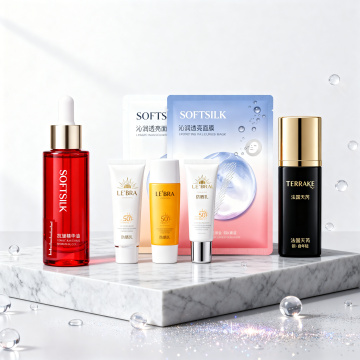 为这张包含四款美妆护肤产品的合成图添加整体化妆品标题,标题放在画面上方醒目位置,文字清晰美观,保持所有产品不变。修改图片尺寸为长410mm宽540mm,画面整体保持轻奢优雅风格,整体明亮干净,商业高级美妆摄影画质。