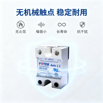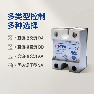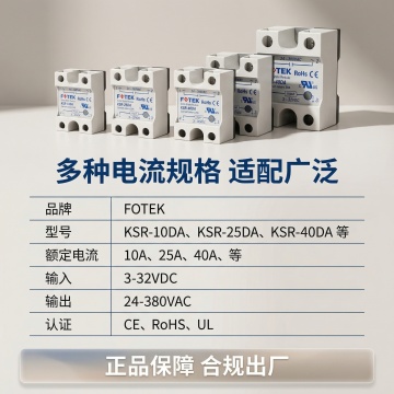 [主图 1 品牌首图] 主图主题:台湾阳明FOTEK固态继电器首图。氛围风格:舒适简约家居治愈风,专业品质感。画面元素:固态继电器产品居中放置,产品外观与上传图片完全一致,浅米灰色简约渐变背景,柔和自然光影,主体清晰突出,背景干净通透。配色色系:主色调浅米灰,辅助色为产品本身的白色和品牌蓝色。视角构图:正面平视拍摄,产品主体占画面约60%,景深适中。文字版式:左上角主标题"台湾阳明 FOTEK 固态继电器",字体为粗体无衬线,深蓝色;下方副标题"品质可靠 规格丰富",字体小一号,灰色;右下角蓝色标签"型号 KSR-25 DA 25A",白色文字,符合极简悬浮原则,文字不遮挡产品主体。比例分辨率:2k 分辨率
