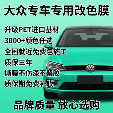 [文字版式] 主标题 "升级PET汽车改色膜",副标题 "进口基材 3000+颜色任选",右上角金底白字标签 "全国包施工";字体采用无衬线粗体,主标题大字号,副标题字号缩小50%;文案悬浮于画面左上角留白区域,不遮挡车身主体;画面底部半透明渐变蒙层横向排列 "三年质保 贴坏包贴",白色字体,整体构图专业透气。