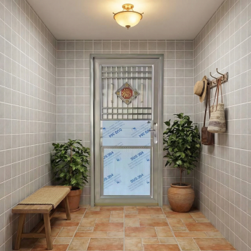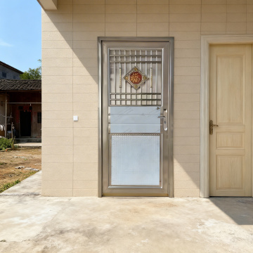 基于原图的不锈钢门,生成农村自建房二层阳台入户无字场景图,不添加任何文字,保持原不锈钢门样式不变,场景为农村自建房二楼阳台入口,外墙贴米白色瓷砖,远处可见乡村远景,午后自然光,真实乡村风格,无任何文字