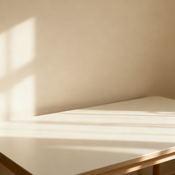 极简主义风格的桌面背景,浅原木色实木桌面,柔和的自然光透过百叶窗在米白色墙壁和桌面上投下清晰的条形光影,光影层次分明,温暖治愈的氛围,桌面上可摆放绿植、简约茶具、书籍或设计感文具等不同摆设,整体色调可尝试浅灰蓝、薄荷绿或奶油白等不同配色,场景可设定为书房、客厅角落或卧室飘窗,保持画面干净整洁,光影效果突出,营造宁静舒适的居家办公或休憩空间感。