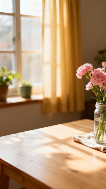 电商产品展示背景,暖调日系居家场景,浅原木色桌面,背景是纱帘窗户和模糊绿植,透过纱帘的柔和自然光,整体朦胧治愈,留白充足,适合放置产品,竖版8K高清