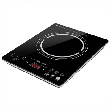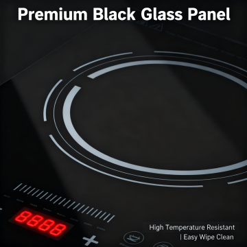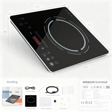保持原电磁炉产品外观完全一致,将产品放置在现代简约厨房台面上,营造温馨家居厨房风氛围,暖调自然光,简洁干净的北欧风厨房,背景为浅灰色哑光橱柜和石英石台面,产品放置于画面中心位置。顶部主标题文字 "Powerful Heating Uniform Cooking",无衬线白色粗体大字,底部三行核心卖点英文:"High Power Stir-frying | Uniform Heating | High Temperature Resistant Easy to Clean",每个卖点配小圆形图标,文字不遮挡产品主体,风格统一,符合跨境电商设计规范