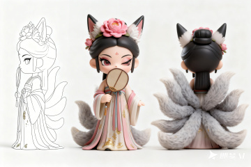 软3D风国潮娃娃,融合中式美学与梦幻色彩,樱花发饰点缀温柔面容,背景山水意境悠远,尽显可爱与唯美感。