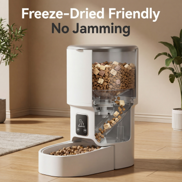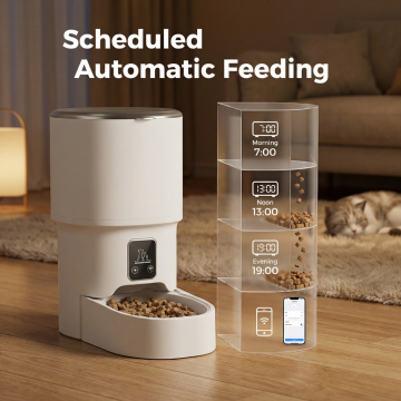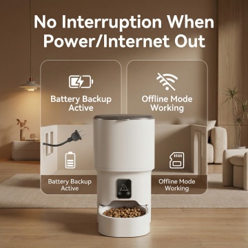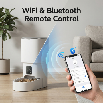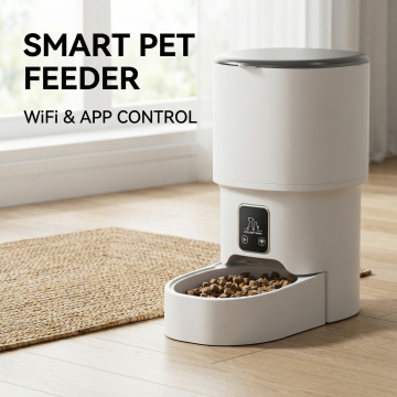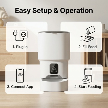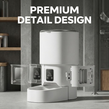 参考第二张图片的产品信息排版设计,只放第一张的智能宠物喂食器产品,严格保留第一张产品外观不改变,把原中文文字全部转为英文,标题为"Product Information",包含WiFi & Bluetooth APP Control、4L Capacity Food Tank、Battery Backup Available、No Food Interruption During Outage、Freeze-Dried Compatible Non-Clogging等产品参数,尺寸800X800,欧美跨境电商风格,非白底,设计美观有质感,不包含第二张的产品