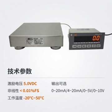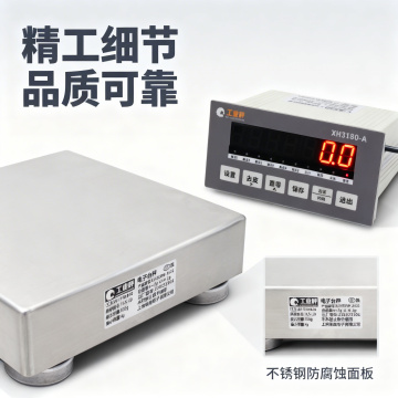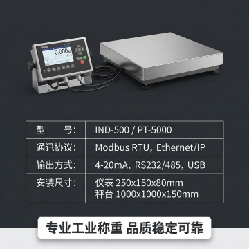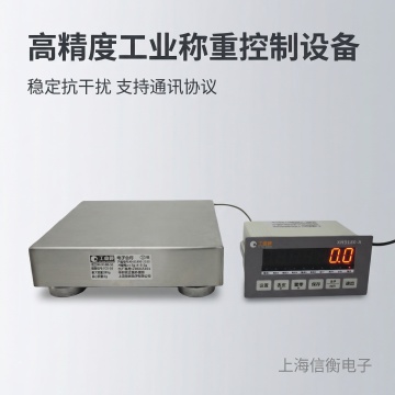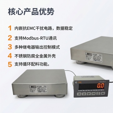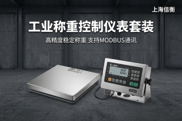 [文字版式] 主标题 “适配工业现场稳定称重”,左上角悬浮深灰色粗体,文字不遮挡产品主体。右下角标注 “高精度稳定输出”,小字深灰色。