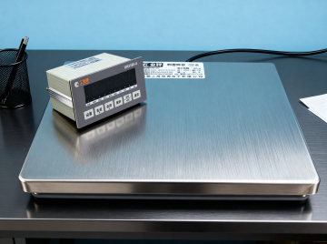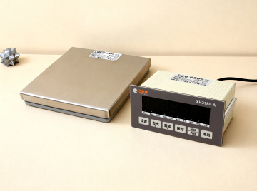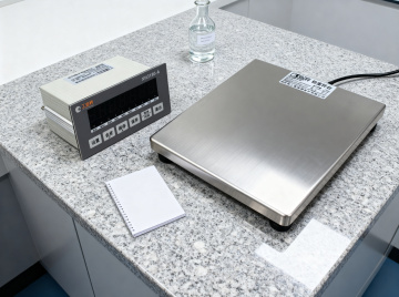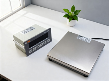 [画面元素] 整套称重设备放置在干净的灰色工业车间工作台面上,背景是虚化的现代化生产车间,有轻微光斑效果,突出产品主体。产品保持原有外观结构和文字不变,连线自然,整体融入真实工作环境。柔和车间顶光,阴影清淡自然。