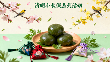 清新淡雅的水墨风插画,融合轻拟物与水彩质感,展现清明时节的柔和与舒适。青团置于竹叶之上,搭配垂柳与远山,传递中式传统意境。