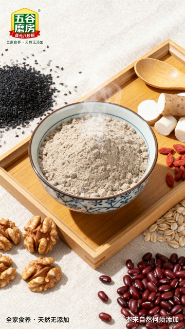 3D建模渲染的高端五谷粉营销海报,超写实质感,细腻光影,产品居中摆放,45°黄金商业拍摄视角,俯视微侧角度,画面干净高级。主体为一罐精致包装的五谷养生粉,旁边摆放一碗冲调好的热气腾腾的五谷粉,周围自然散落燕麦、黑米、黑芝麻、核桃、红豆、山药等天然谷物,食材饱满有质感,整体氛围温暖治愈、健康养生。色调柔和暖米色,自然光柔和打光,高清8K,细节逼真,商业海报质感,留白充足。海报上保留文字:主标题"天然五谷粉 营养每一天",副标题"古法研磨·0添加·更健康",去掉图片下方的营销话术"养胃代餐、早餐便捷、饱腹营养、老少皆宜、天然无蔗糖、现磨好吸收"。整体风格简约轻奢、中式养生,适合电商主图、朋友圈宣传、产品详情页。