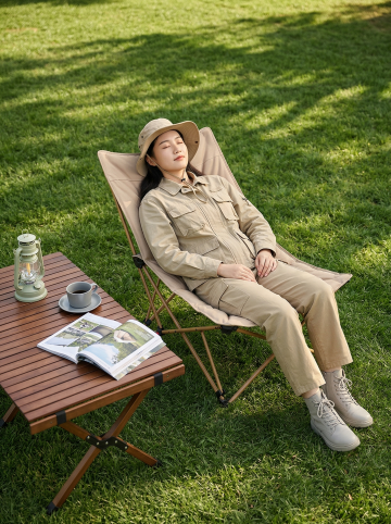 卡其色折叠躺椅,保持产品原有物理结构绝对不变,Logo文字"WHITSUNDAY"原样保留,严禁扭曲变形。一位二十多岁的东亚长发女性,戴着卡其色宽檐帽,穿着白色短袖衬衫、卡其色马甲、米色短款工装裤、黑色战斗靴,悠闲地躺在这张卡其色折叠躺椅上,双眼闭着,双手放在腹部。椅子放置在茂盛的绿草地上,背景是一片带有小瀑布的森林湖泊,自然环境清新幽静。清透自然日光,浅景深效果,人物和椅子清晰对焦,背景自然虚化,商业产品摄影风格,超细节质感,画面氛围种草感,整体柔和通透,保持人物与产品自然互动,符合真实物理空间规律