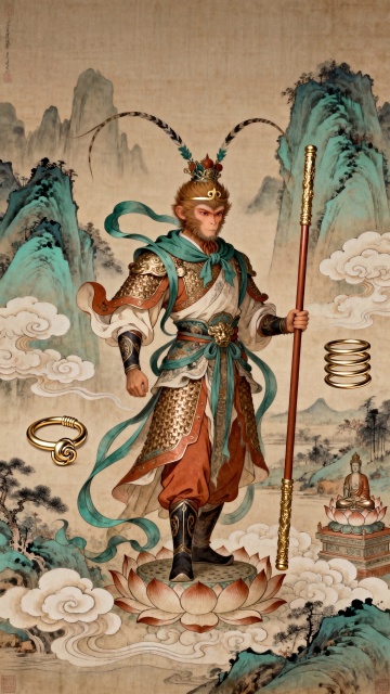 中国神话风格,哪吒位于画面中心,三头六臂,六臂分别握持火尖枪、乾坤圈、混天绫、金砖、九龙神火罩、阴阳双剑,身着红色莲花战甲,战甲边缘有金色火焰纹路,混天绫如火焰般在周身飞舞飘扬,脚踩风火轮,火焰从轮中喷涌而出,背景是翻腾燃烧的橙红色火山云雾,云雾中隐约可见暗红色岩石轮廓,整体光影呈现强烈的逆光效果,哪吒身影被背后强光勾勒出金色轮廓,画面充满史诗感与力量感,细节丰富的3D渲染,高对比度,浓厚的神话氛围。