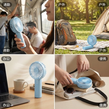 [主图 4 多场景展示],[主图主题]便携式小风扇多场景使用展示,[氛围风格]生活化真实场景,自然明亮光影,[画面元素]四宫格排版展示四个使用场景:1 上班族办公桌放置 2 学生宿舍桌面使用 3 外出逛街手持 4 户外露营随身携带,四个场景均展示本款白色小风扇,场景自然真实,光影统一,[配色色系]整体色调清新明亮,每个场景自然配色协调统一,[文字版式]顶部主标题"多场景适用 随时随地清凉"大字号加粗白色居中悬浮,每个场景角落标注场景名称小字白色,不遮挡产品主体,[比例分辨率]2k分辨率,产品外观必须和原图保持100%一致
