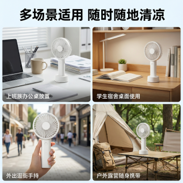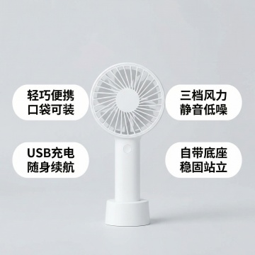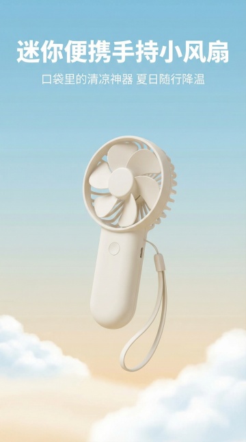 [主图1] 便携式充电手持小风扇首图,小清新夏日风格,清爽干净的浅蓝色桌面场景,白色小风扇居中放大展示,主体完整清晰,占比约60%,桌面浅景深虚化背景,自然柔光光影。文案主标题 "夏日清凉 随手可得",副标题 "迷你便携 持久续航",右下角浅蓝胶囊标签 "可立可握",主标题为黑色粗体无衬线最大字号,副标题灰色较小字号,文字均悬浮于背景不遮挡产品主体,整体构图平衡高级,画面干净通透。