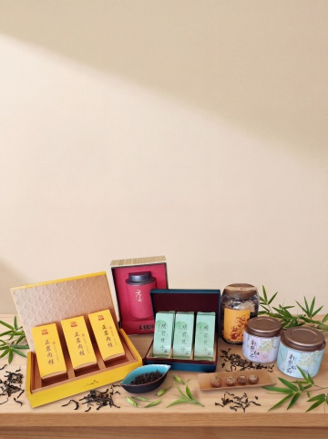 在桌子前方添加自然的茶树枝叶作为前景虚化,在桌面产品旁散落几片新鲜绿色茶叶,增强茶叶场景真实氛围感,保持原有产品、构图、排版和色调不变,不添加任何文字,整体自然高级