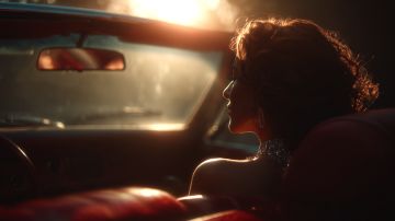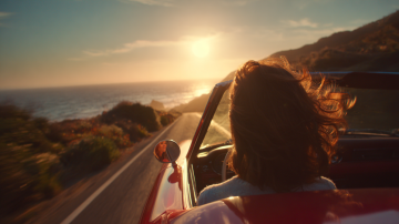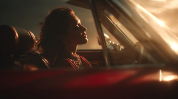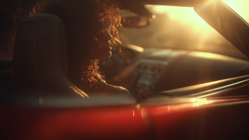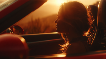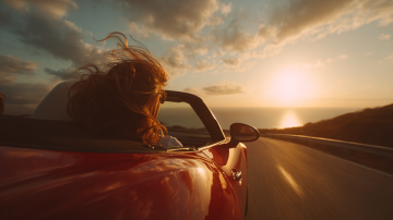 写实摄影风格,一辆红色轿车在开阔的公路上行驶,车头略微偏向左侧,车身呈现出流畅的线条和金属质感。天空中布满了橙红色的云彩,夕阳的光芒从云层中透射出来,照亮了整个场景。公路的路面平滑,车轮在行驶中带有轻微的动感模糊。道路两旁是茂密的绿色树林,树木高大挺拔,远处的地平线清晰可见。整体画面色彩浓郁,光影对比强烈,营造出一种温暖而充满活力的氛围,展现出车辆在自然景色中行驶的动感与美感。