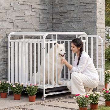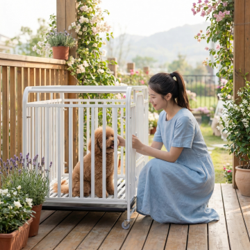 类似参考图片,一位女士在户外花园抚摸白色狗笼里的小型幼犬,自然光影,清新治愈风格,保留白色狗笼产品主体,更换不同场景、不同女士人物,笼子里都是小型狗狗,图片比例1:1