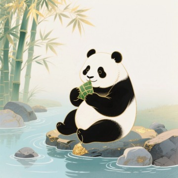 卡通感熊猫拟人化设计,扁平风配色鲜明,极繁主义细节隐藏于表情,印刷风质感突出,节日氛围浓郁。