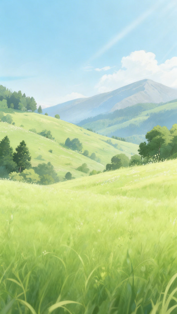 手绘风格的自然风景画,画面主体为层次分明的绿色草原,近处是起伏的浅绿色草坡,覆盖着细腻的笔触纹理,中景是茂密的深绿色松树林,呈现出明显的手绘线条感,远处是巍峨的雪山,山顶覆盖着白色积雪,山体用深浅不一的蓝色和灰色笔触勾勒,背景是纯净的蓝色天空,点缀着几朵白色云朵,整体色彩明快清新,光影柔和,展现出宁静悠远的自然氛围,具有手绘插画的独特质感和艺术表现力。