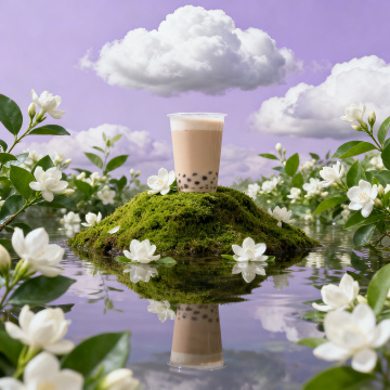 一杯奶茶展台位于画面中心,被绿色苔藓覆盖的小丘托起,周围环绕着盛开的白色茉莉花与翠绿叶片,清澈水面倒映着展台与花朵,上方是漂浮着蓬松白云的淡紫色天空,整体呈现柔和梦幻的莫兰迪色调,光线明亮柔和,营造出清新自然的氛围,画面构图平衡,主体突出,细节丰富。