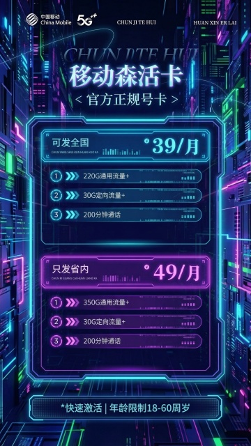 保持原有文字内容不变:移动腾跃卡官方正规号卡,39元/月250G(220G通用流量+30G定向流量+200分钟通话),49元/月380G(350G通用流量+30G定向流量+200分钟通话),快速激活,年龄限制18-60周岁,保留中国移动5G标志,设计商务风格不同排版的宣传海报
