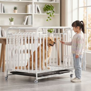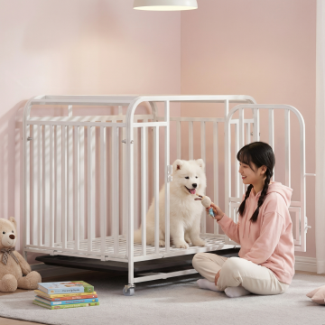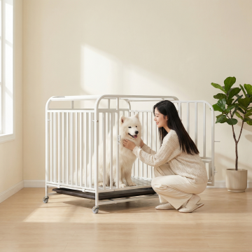 类似参考图片,一位女士在室内客厅和白色狗笼里的银狐犬互动,暖光氛围,简约干净风格,保留白色狗笼产品主体,更换不同场景、不同女士人物、不同狗狗