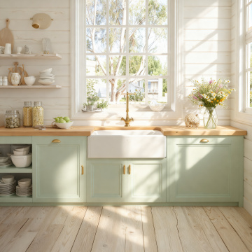 极简主义风格的厨房台面特写,柔和的蓝灰色调,木质纹理的浅色桌面,前景摆放着一个白色小花盆,里面插着一朵鲜艳的黄色花朵,背景是干净的白色橱柜和带有磨砂质感的窗户,窗台上整齐排列着白色陶瓷罐和装有黄色小花的花瓶,整体画面呈现出宁静、整洁、现代的北欧氛围,光线柔和,阴影细腻,色调统一和谐,营造出舒适放松的居家环境。