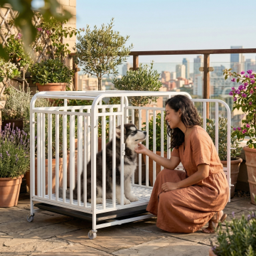 类似参考图片,一位女士在阳光书房和白色狗笼里的哈士奇互动,安静治愈风格,保留白色狗笼产品主体,更换不同场景、不同女士人物、不同狗狗,图片比例1:1