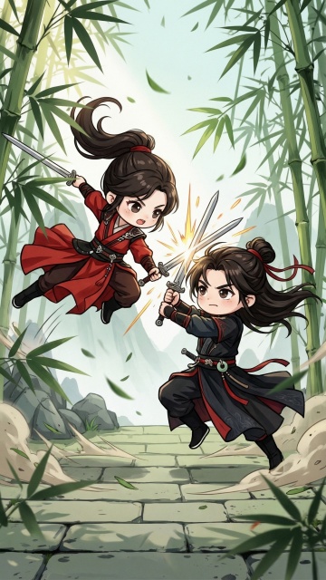 去掉图上所有武器周围的光效,把前景的2个人物整体往上移动,图片下方留出一点空地;将背景后方的三个人物整体缩小一些,调整人物大小符合透视关系,保持Q版古风武侠的整体风格不变。