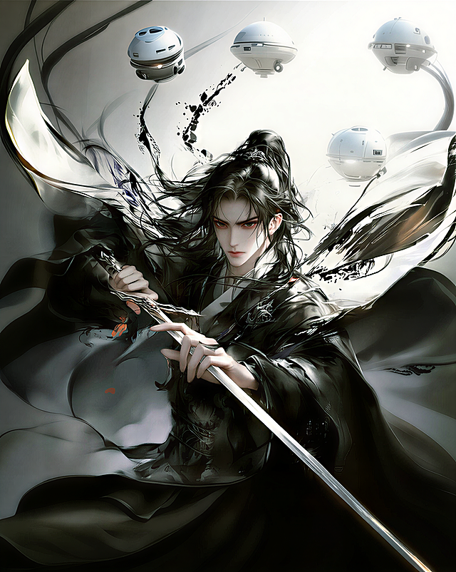 水墨风与工笔技法融合,黑衣侠客持剑而立,神情严峻,尽显古典神秘与国潮气韵,故事感十足。详情