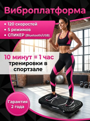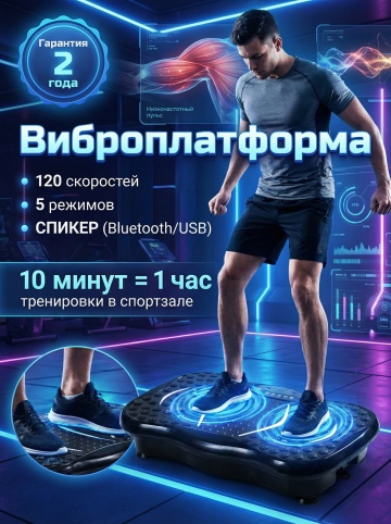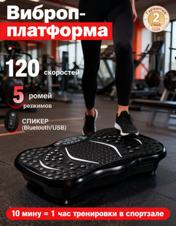 这是一款甩脂机产品宣传海报,现代简约风格,背景为现代化健身房全景,展示一位女性正在使用这款黑色甩脂机锻炼,特写使用腿部。海报上添加俄语文案,主标题是"Виброплатформа", 核心卖点文字:"120 скоростей", "5 режимов", "СПИКЕР (Bluetooth/USB)", 宣传文案:"10 минут = 1 час тренировки в спортзале"。画面右下角添加一个圆形徽章,徽章内有醒目的文字" Гарантия 2 года"。采用活力橙配色文案,视觉冲击力强,突出产品,体现低频脉冲刺激肌肉促进循环,传递便捷舒适、放松解压的使用体验。