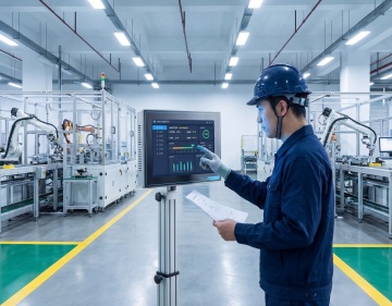 一位男性技术人员正在不同的工业工作场景中进行设备检查与操作,他头戴黄色安全帽,帽前配有照明头灯,身穿深蓝色工装制服与橙色反光安全背心,戴着护目镜和红色耳塞,正专注地手持平板电脑或检测仪器,观察着面前复杂的电气控制柜与密集的彩色线路。场景采用写实风格的职业摄影,光线呈现出工业环境中特有的局部照明效果,主色调为深蓝、深绿与橙色的对比搭配,画面具有清晰的景深和丰富的细节质感,展现出专业、严谨且略带紧张专注的工作氛围,构图突出人物与设备的互动,背景可替换为工厂车间、机房、维修站等不同的工业工作场景,整体传递出技术人员在真实工作环境中认真负责的职业形象。