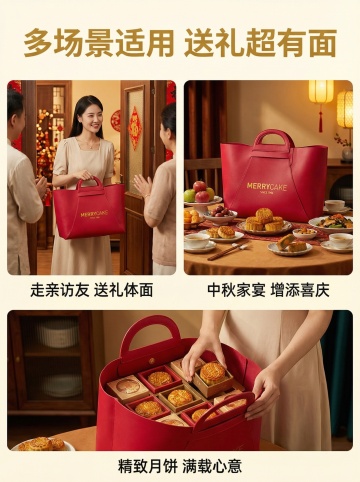 特写镜头,在一幅展开的古卷式背景上,精致的六角形红木礼盒静静置于青玉案几中央,盒面以螺钿工艺镶嵌出寒梅傲雪图,金线勾勒的"中秋月礼"四字印章庄重典雅。礼盒左侧斜倚着一柄象牙白瓷茶壶,壶嘴袅袅升起几缕金色茶雾,右侧铺展着三张酥皮月饼:一枚蟹壳黄的火腿五仁饼上撒着芝麻,一枚流心奶黄饼微微裂开露出琥珀色内馅,最前方的莲蓉双黄饼旁斜插着一支丹桂。背景是水墨渲染的远山与一轮朦胧圆月,案几边缘垂落着半透明的玉色流苏,空气中浮动着细小的桂花金粉。海报上方"月满人间·饼承心意"八个篆字采用烫金立体字,下方"苏式鲜肉 × 广式莲蓉 × 新式流心"的产品说明旁点缀着三枚迷你月饼剪影,整体色调以紫檀木色为底,搭配月白、蟹壳黄与桂花金,营造出雅致庄重的中秋礼赠氛围。