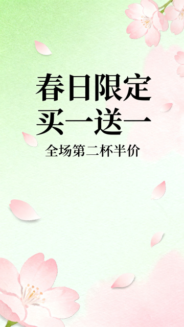 春日奶茶店促销海报,清新治愈风格,淡绿加浅粉渐变配色,加入樱花元素,主标题文字是“春日限定买一送一”,副标题文字是“全场第二杯半价”,简约排版,高清商用,春日渐变樱花背景