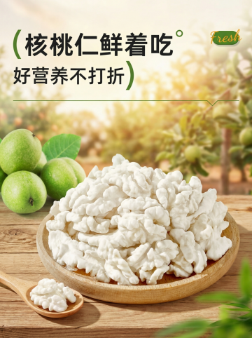 给图片标题“脱衣鲜核桃仁”六个字添加一圈白色的外边框,保持其余所有内容、品牌logo、核桃仁、背景、其他文字和整体构图都不变,只添加白色边框