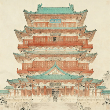 工笔与岩彩交融,水墨晕染间展现古典中式建筑的静谧神圣,浮雕式细节勾勒出层层飞檐的庄严之美。