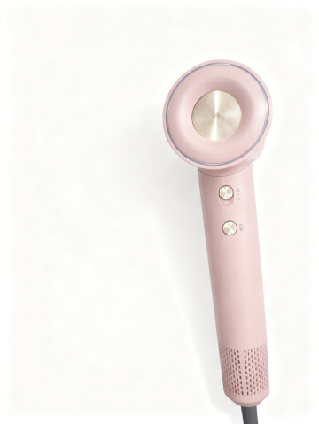 设计直发梳外观造型,极简科技风,机身采用磨砂雾霾蓝哑光材质,线条利落干练,侧边设置隐形触控按键,梳齿做防静电硅胶包裹设计,底部有磁吸充电底座,整体简洁高级,置于纯白背景,光线柔和凸显质感