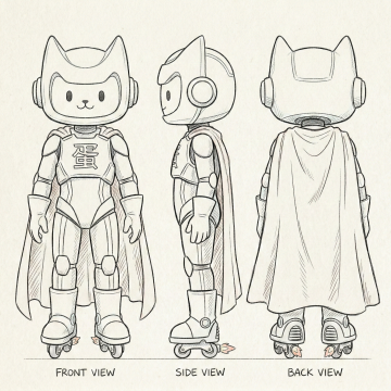 白描风卡通机器人,拟人化猫耳头盔,软3D质感机械装甲,配披风与滑轮鞋,融合未来科技与可爱元素,单色线条勾勒,肌理印刷感背景。