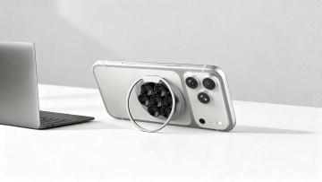[画面元素] 展示手机依靠支架立起的使用状态,放置在浅色桌面,桌面干净整洁,背景留白,突出支架支撑功能,整体画面自然实用