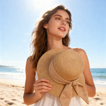 重新更改模特身上的米白色套装,颜色保持米白不变,将套装面料准确替换为参考图片提供的亚麻纹理面料材质,保持服装款式、黑色条纹装饰和整体海景背景不变